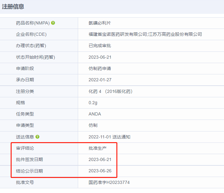 6月26日,福建省寶諾醫(yī)藥研發(fā)有限公司氨磺必利片(規(guī)格:0.2g)經國家藥品監(jiān)督管理局批準上市,批準文號:國藥準字H20233774。